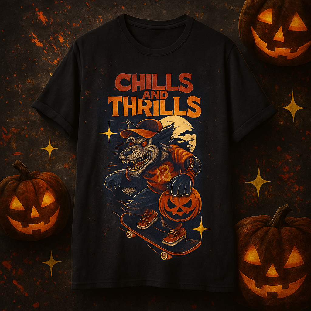 Chills and Thrills Skateboarding Halloween T-Shirt | Unisex Graphic Tee, Spooktacular Gift, Halloween Party Wear, Casual Streetwear,
